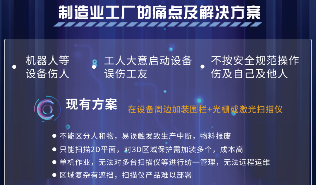 在制造業工廠,人員安全倍受重視。伴隨著工廠自動化、數字化、智能化程度逐漸提升,使用大型機械設備工作的區域也越來越多。曾有多個工廠發生過人員進入設備工作區域的安全事故。當下,攝像頭已遍及工廠的各個角落,但其監控僅能在事故后溯源,并不能預防和預警事故發生。現有的安全生產解決方案是在設備周邊加裝圍欄和光柵,并在區域內部署激光掃描儀,但掃描儀產品常常因為人和物不分造成誤檢引發設備頻繁停機,致使物料報廢、工序中斷、工時耽誤等。如何精確保障生產過程中的人員人身安全,如何做到安全生產與高效生產的協同,是工廠一直以來的痛點所在。