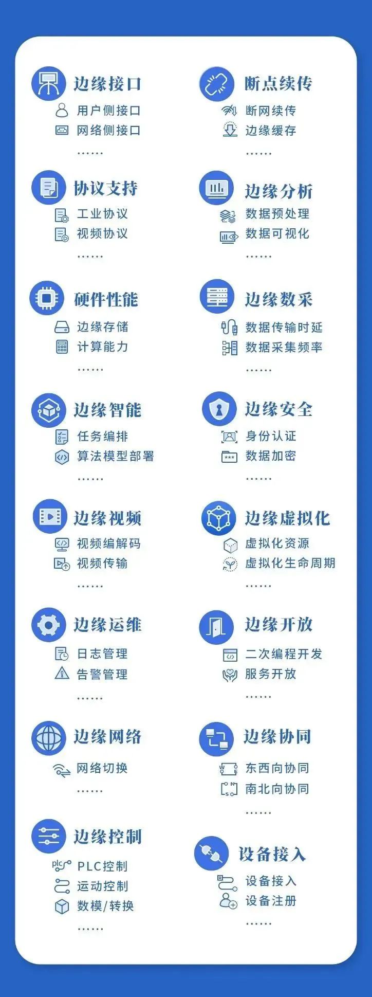 中國信通院聯(lián)合產(chǎn)業(yè)各方積極推進邊緣計算關鍵技術標準研制,已完成包括《工業(yè)互聯(lián)網(wǎng)邊緣計算 總體架構(gòu)與要求》、《工業(yè)互聯(lián)網(wǎng)邊緣計算 邊緣節(jié)點模型與要求 邊緣控制器》、《工業(yè)互聯(lián)網(wǎng)邊緣計算 邊緣節(jié)點模型與要求 邊緣網(wǎng)關》、《工業(yè)互聯(lián)網(wǎng)邊緣計算 邊緣節(jié)點模型與要求 邊緣云》、《基于邊緣計算的機器視覺 第4部分:測試方法》等20余項國家/行業(yè)/團體標準制定工作。“邊緣計算標準件計劃”依托上述標準開展產(chǎn)品測試,覆蓋邊緣計算通用設備、軟件平臺以及邊緣視覺設備等11類產(chǎn)品,并圍繞邊云協(xié)同、邊緣智能、邊緣數(shù)據(jù)、邊緣控制等方面形成16大類一級測試指標,112個二級測試指標。