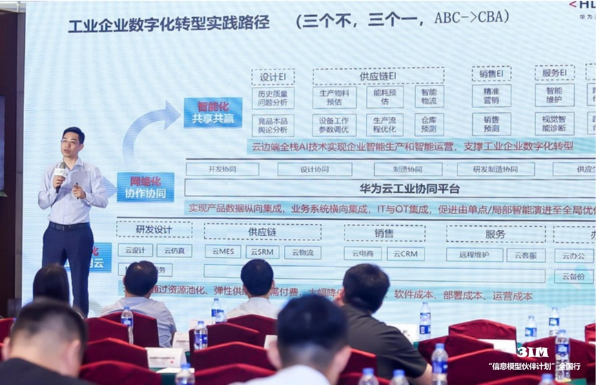 與會單位圍繞政府政策、數據融合互操作、數字化工具供給、數字化技術應用等方面展開交流和對接,并分別就中小企業數字化發展路徑、信息模型賦能、未來建議等進行主題研討。中小企業數字化轉型實踐路徑包含三個階段:一是數據資源池化,企業研發設計、供應鏈、銷售、服務、辦公等數據可通過公有云來滿足各業務階段數字化轉型需求,降低軟件部署和運營成本。二是網絡化,通過產品數據縱向集成,業務系統橫向集成,促進由單點/局部智能向全局優化發展。三是智能化,利用云邊端全棧AI技術實現企業智能化生產和運營。