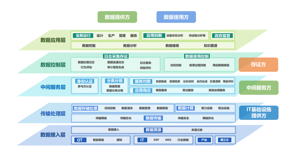 結合供需矩陣形成可信工業數據空間的功能視圖(如圖2所示),自下而上分別為: 數據接入層、傳輸處理層、中間服務層、數據控制層以及數據應用層。其中藍色的三層是數據共享流通的基礎與載體,黃色的兩層實現了數據共享流通的可信與透明,也是可信工業數據空間的核心部分。