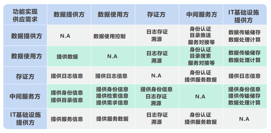 根據業務視圖中各方主體扮演的角色以及之間的供需關系,可以歸納出一個功能的供需矩陣 (如圖1所示)例如: 縱軸[數據提供方]與橫軸[數據使用方]對應的[數據使用控制單元意為數據提供方]需要[數據使用方]執行[數據使用控制]。