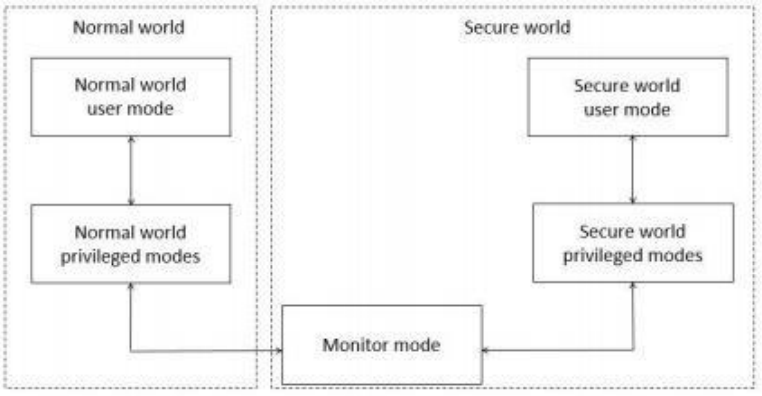 ARM公司提出的TrustZone技術實現硬件隔離機制,主要針對嵌入式移動終端 處 理 器 。T r u s t Z o n e 在 概 念 上 將 S o C 的 硬 件 和 軟 件 資 源 劃 分 為 安 全(SecureWorld)和非安全(NormalWorld)兩個世界。所有需要保密的操作在安全世界執行(如指紋識別、密碼處理、數據加解密、安全認證等),其余操作在非安全世界執行 (如用戶操作系統、各種應用程序等),安全世界和非安全世界通過一個名為MonitorMode的模式進行轉換,如圖2-5: