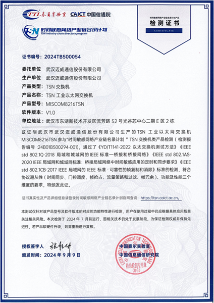 2024年8月,武漢邁威通信股份有限公司(以下簡稱邁威)研發的MISCOM8216TSN型工業以太網TSN交換機,在互聯網與工業融合創新工信部重點實驗室順利通過名錄計劃產品評測,獲得交換機類檢測證書。