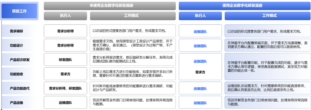 3、數字化執行團隊的結構簡化,一個運維團隊可以完成過去需求分析師、研發團隊以及運維團隊才能完成的工作。