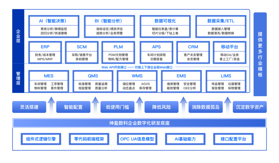 企業數字化研發底座以信息模型概念為基礎,搭載坤盈數科自主研發的“組件式邏輯引擎”和“零代碼前端框架”等技術集,面向企業數字化研發過程中面臨的功能研發、部署、迭代、多系統集成、企業數據挖掘、AI賦能等課題給出了一系列研發工具。坤盈數科的宗旨是“只需要一個平臺,就可以解決企業數字化建設的所有問題。通過使用企業數字化研發底座,企業能夠由非IT技術人員完成數字化應用的搭建,并真正的實現“敏捷研發”,縮短從需求到功能落地之間的步驟,降低數字化項目風險,大大縮減項目研發成本和周期,使企業數字化的落地實施更加平滑。