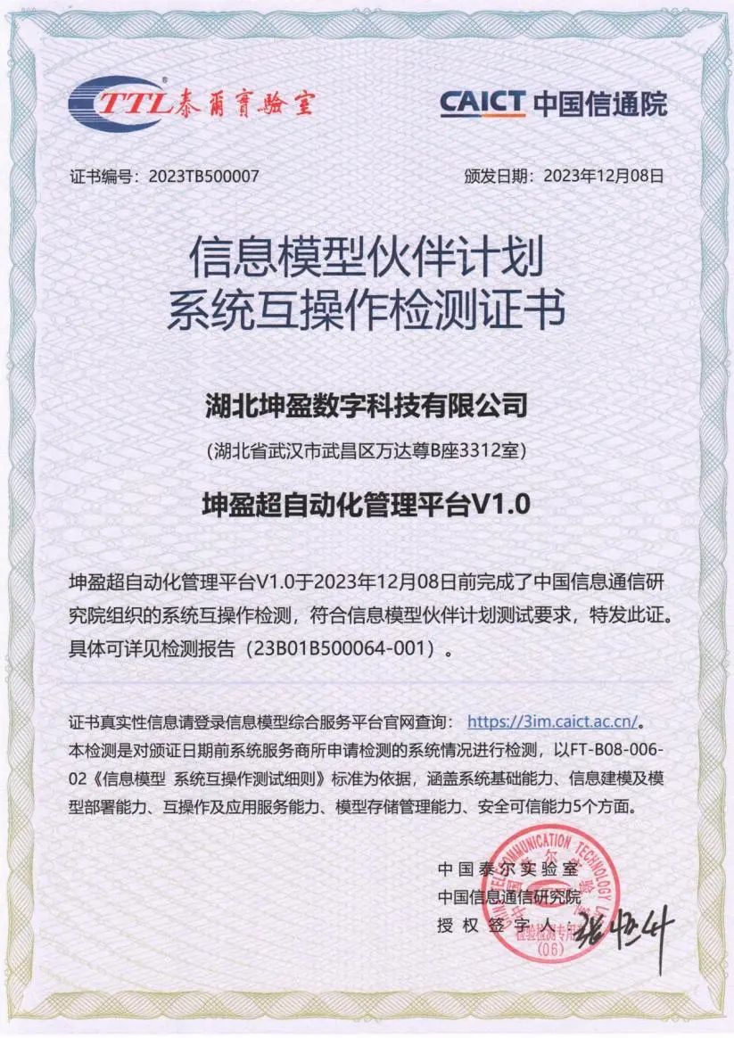 湖北坤盈數字科技有限公司(以下簡稱“坤盈數科”)是工業互聯網產業聯盟信息模型伙伴計劃伙伴單位,自主研發的坤盈超自動化管理平臺V1.0是基于坤盈數科企業數字化研發底座衍生出的綜合管理平臺,該平臺完成了中國信息通信研究院組織的系統互操作檢測。