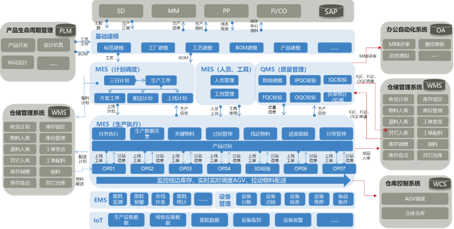 項目應(yīng)用信息模型等技術(shù)打通自動化生產(chǎn)與運營系統(tǒng),搭建統(tǒng)一數(shù)據(jù)采集和分析平臺,支持生產(chǎn)、質(zhì)量、設(shè)備、能耗等數(shù)據(jù)的采集與多維度分析。項目開發(fā)的MOM平臺集成了MOM、QMS、EAM、EMS等自動化生產(chǎn)與運營功能,并預(yù)留統(tǒng)一數(shù)據(jù)接口,支持現(xiàn)有和正在建設(shè)的PLM、SCADA、WMS等系統(tǒng)集成,實現(xiàn)生產(chǎn)排程、過程管控、產(chǎn)品質(zhì)量管理、設(shè)備維護、能源監(jiān)控等的智能化,輔助企業(yè)決策,具體實施方案如圖2所示。