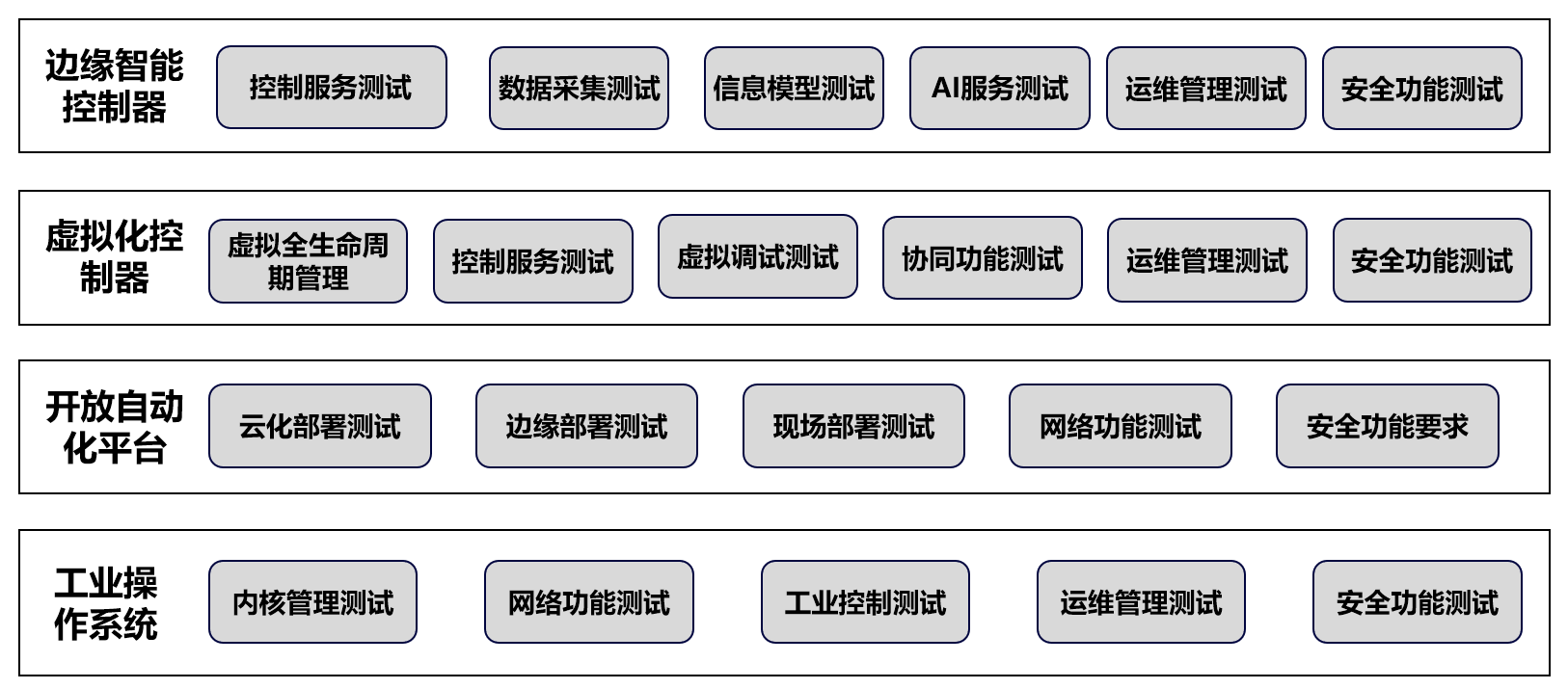 新型工業(yè)控制產(chǎn)品測試對象包括邊緣智能控制器、虛擬化控制器、開放自動(dòng)化平臺(tái)、工業(yè)操作系統(tǒng)智能數(shù)采與監(jiān)視系統(tǒng)