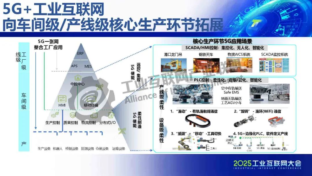 5G一張網打通IT與OT,突破接口協議兼容、網絡確定性等核心技術,實現“數據上得來、管理下得去”,支持柔性化、智能化生產。