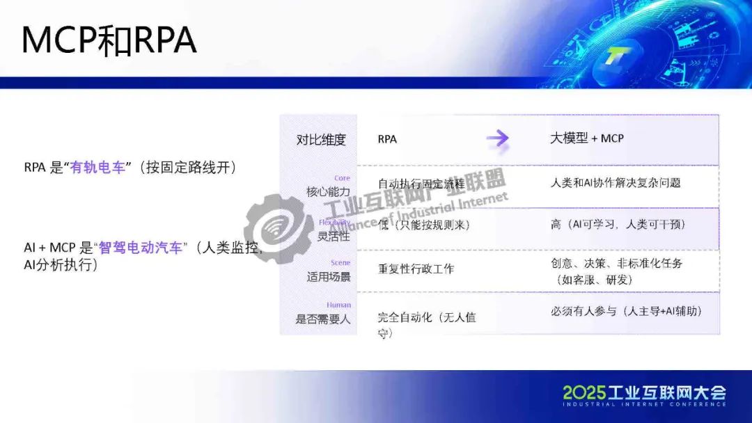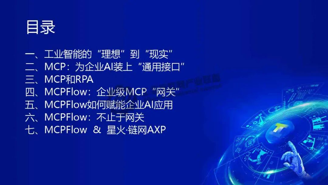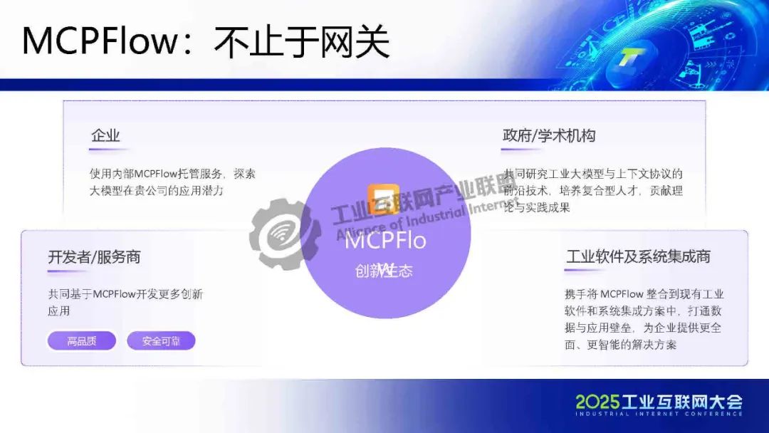 賀松介紹,基于MCP協議的AI落地解決方案,解決企業數字化轉型兩大痛點:1)業務語境缺失——通過標準化接口注入訂單狀態、客戶信息等上下文,使大模型精準理解業務語義;2)數據孤島問題——MCPFlow平臺集成ERP、CRM等系統工具鏈,實現"搭積木式"AI服務調用,將開發周期縮短70%。結合中國信通院"星火鏈網"構建可信AI智能體交換中心(ASP),確保內外數據安全互通。該方案推動大模型從概念走向業務控制,實現人機協同決策,形成開放AI生態