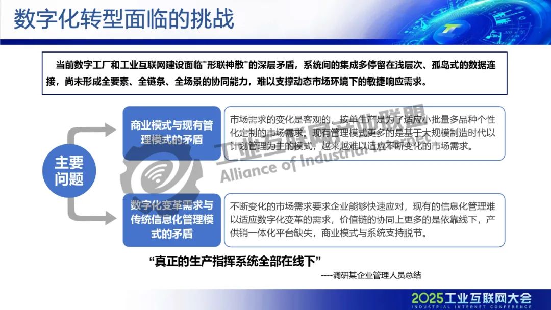 趙海建介紹,當(dāng)前數(shù)字工廠和工業(yè)互聯(lián)網(wǎng)建設(shè)面臨"形聯(lián)神散"的深層矛盾,系統(tǒng)間的集成多停留在淺層次、孤島式的數(shù)據(jù)連接,尚未形成全要素、全鏈條、全場(chǎng)景的協(xié)同能力,難以支撐動(dòng)態(tài)市場(chǎng)環(huán)境下的敏捷響應(yīng)需求。依托工業(yè)大數(shù)據(jù)分析平臺(tái)建設(shè)和人工智能算法應(yīng)用,在質(zhì)量管控、能效優(yōu)化、設(shè)備管理以及基于畫像的精準(zhǔn)營銷服務(wù)方面進(jìn)行全方位探索和應(yīng)用,深度挖掘數(shù)據(jù)資產(chǎn)價(jià)值,形成工業(yè)機(jī)理模型,支撐數(shù)據(jù)驅(qū)動(dòng)的智能化轉(zhuǎn)型升級(jí)。