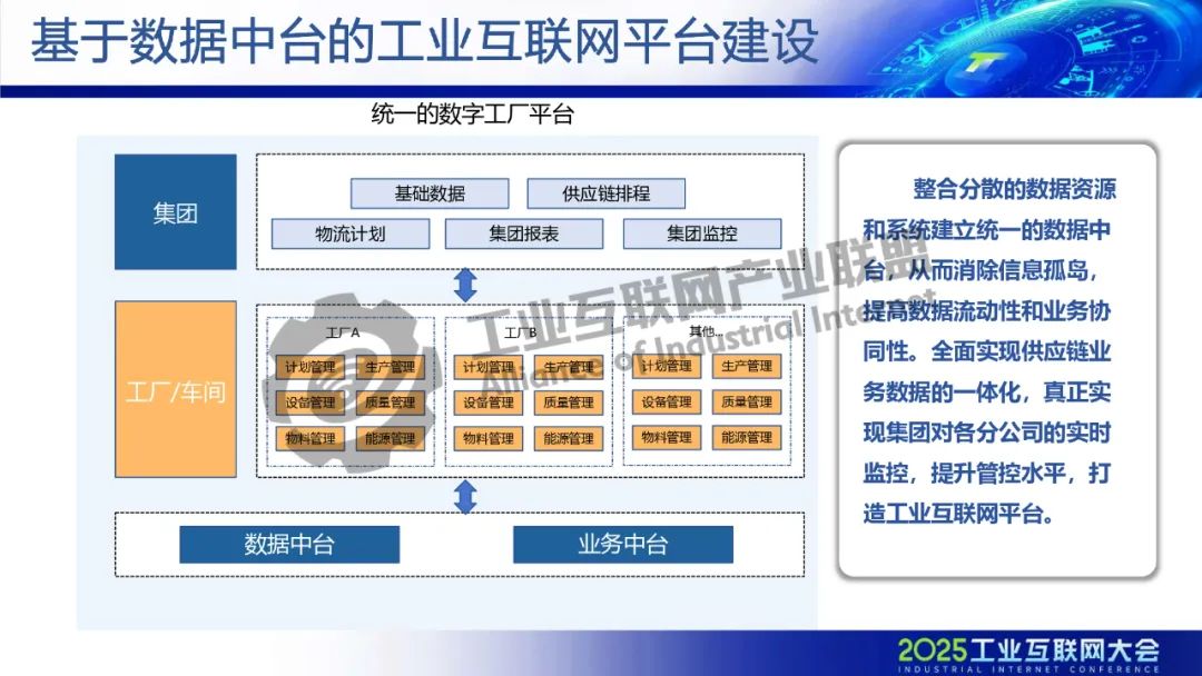 整合分散的數(shù)據(jù)資源和系統(tǒng)建立統(tǒng)一的數(shù)據(jù)中臺(tái),從而消除信息孤島,提高數(shù)據(jù)流動(dòng)性和業(yè)務(wù)協(xié)同性。全面實(shí)現(xiàn)供應(yīng)鏈業(yè)務(wù)數(shù)據(jù)的一體化,真正實(shí)現(xiàn)集團(tuán)對(duì)各分公司的實(shí)時(shí)監(jiān)控,提升管控水平,打造工業(yè)互聯(lián)網(wǎng)平臺(tái)。