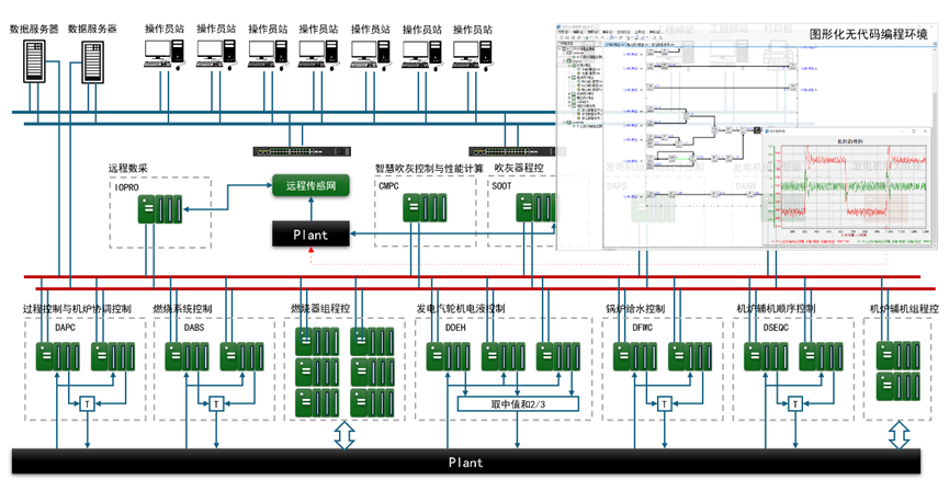 充分利用CodeOne工控軟件平臺中的數據引擎技術構建新型火電機組分布式控制系統(DCS),實現全球首例基于PLC的DCS控制站集群,適應新型電力系統對煤電機組深度調峰、快速爬坡等靈活性調節的需求。打破傳統外掛模式限制,針對生產環境惡劣、經營決策效率低、數據集成與共享難等痛點,實現智能控制與DCS的一體化集成。