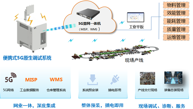 5G原生產線調試系統,作為服務產線的輕量化便攜工具,基于UniEngine算網一體機預集成5G網絡和明珞MISP(工業物聯網智能制造服務平臺),實現云網業一體化部署,OICT深度融合。項目現場開機即用,實現5G網絡和產線應用同步上線,減少網絡和應用系統部署成本和時間,縮短產線交付、調試和量產周期,提高產線服務效率。