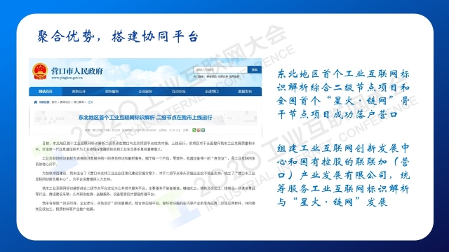 8月30日下午,在2020工業(yè)互聯(lián)網(wǎng)大會(huì)“工業(yè)互聯(lián)網(wǎng)標(biāo)識(shí)”主題論壇上,營口市市委副書記、營口市政府黨組書記、市長許桂清以《探索“鏈網(wǎng)協(xié)同”加快全面振興》為題演講,分享了工業(yè)互聯(lián)網(wǎng)+區(qū)塊鏈在營口產(chǎn)業(yè)轉(zhuǎn)型升級(jí)中的探索和應(yīng)用,以及持續(xù)深化“鏈網(wǎng)協(xié)同”,推動(dòng)全產(chǎn)業(yè)鏈提質(zhì)增效升級(jí),提速振興發(fā)展的未來規(guī)劃。