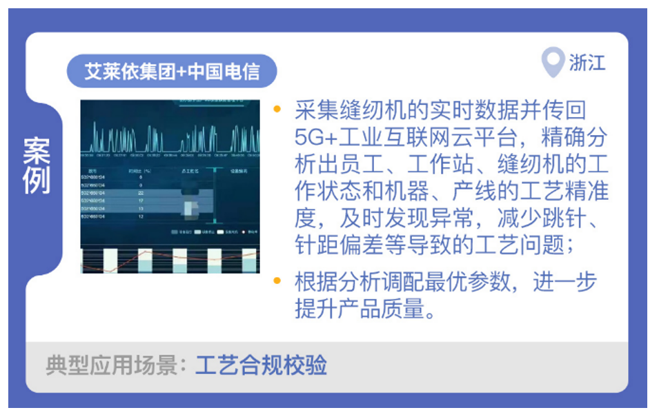艾萊依時尚股份有限公司與中國電信合作,開展“艾萊依5G+工業互聯網云平臺”項目建設,實現了工藝合校驗場景的應用。通過數采模塊對縫紉機實時數據(如縫紉機的啟停、速度、故障、扎針、工站時間等)進行采集,經過5G網絡傳輸至艾萊依5G+工業互聯網云平臺。云平臺將采集的縫紉機實際扎針時間、非扎針時間與工廠MES、標準工時系統(GSD)的數據進行融合分析,生成設備實時針動波形圖及各類生產報表。利用云平臺建模,精確分析出每一個員工、每一個工作站、每一臺縫紉機在任何時刻、任何地點、任意周期的工作狀態,計算每臺機器、每條產線的工藝精準度,及時發現異常,減少跳針、串針、針距偏差導致的串色等工藝問題。根據分析調配最優參數,進一步提升產品質量,為數字工廠的精益生產夯實基礎。