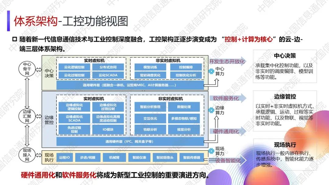 湯立波進(jìn)一步從工控、網(wǎng)聯(lián)、算力三大功能視角對新型工業(yè)網(wǎng)聯(lián)架構(gòu)進(jìn)行了詳細(xì)闡釋。對于未來發(fā)展趨勢,湯立波表示,網(wǎng)聯(lián)三域?qū)⒊尸F(xiàn)出現(xiàn)場域異構(gòu)網(wǎng)絡(luò)融合、邊緣域高質(zhì)量承載網(wǎng)絡(luò)組合、中心域云化網(wǎng)絡(luò)協(xié)同的發(fā)展趨勢,新型工業(yè)控制中硬件通用化和軟件服務(wù)化將成為重要演進(jìn)方向,工業(yè)算力將呈現(xiàn)出“分層調(diào)度、緊密協(xié)同、智能賦能”的趨勢。