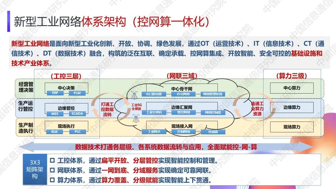 湯立波指出,新型工業(yè)網(wǎng)絡(luò)面向技術(shù)創(chuàng)新推動、應(yīng)用需求牽引、生態(tài)重構(gòu)加速的時(shí)代需求,突出了“泛在互聯(lián)、確定承載、控網(wǎng)算集成、開放智能、安全可控”的新型工業(yè)網(wǎng)絡(luò)五大創(chuàng)新特征。湯立波強(qiáng)調(diào),新型工業(yè)網(wǎng)絡(luò)采用“3X3”矩陣架構(gòu):從能力上,網(wǎng)聯(lián)和算力能力從控制體系分離,形成“控-網(wǎng)-算”三要素協(xié)同的新架構(gòu);從層級上,將以端-邊-云為主體形成更為扁平化的三層級互聯(lián),即工控三層、網(wǎng)聯(lián)三域、算力三級。湯立波表示,工控三層包括現(xiàn)場執(zhí)行、邊緣管控和中心決策,通過扁平開放、分層管控實(shí)現(xiàn)智能控制和管理。網(wǎng)聯(lián)三域包括現(xiàn)場接入網(wǎng)、邊緣匯聚網(wǎng)和中心骨干網(wǎng),通過一網(wǎng)到底、分域服務(wù)實(shí)現(xiàn)確定可靠網(wǎng)聯(lián)。算力三級包括現(xiàn)場算力、邊緣算力和中心算力,通過算力覆蓋、分級賦能實(shí)現(xiàn)智能上下貫通。