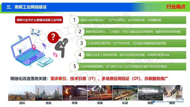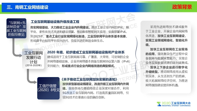 8月30日下午,在2020工業(yè)互聯(lián)網(wǎng)大會“工業(yè)互聯(lián)網(wǎng)網(wǎng)絡(luò)”主題論壇上,南京鋼鐵股份有限公司戰(zhàn)略運營部副部長汝金同以《南鋼工業(yè)網(wǎng)絡(luò)發(fā)展及應(yīng)用》為題作演講,介紹了南京鋼鐵在工業(yè)互聯(lián)網(wǎng)方面的發(fā)展和應(yīng)用情況。