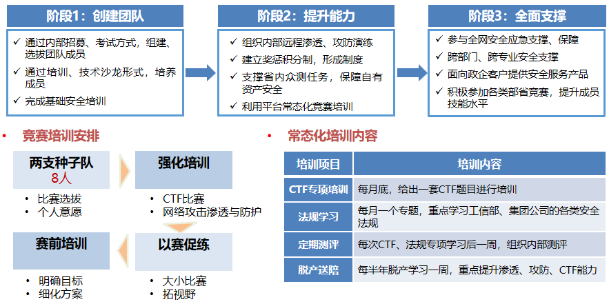 集約化安全運營中心需要一支知守善攻的安全保障團隊。中國移動通信集團安徽有限公司認真規劃安全保障團隊的建設計劃,通過創建團隊、提升能力、全面支撐三個階段,穩步提升人員的綜合實力,并成立專門面向競賽的種子隊,針對性的培養行業頂尖的網絡安全人才,打造一支高水平安全攻防技術隊伍,積極參加企業內外專項行動及重大活動的網絡安全保障工作,覆蓋公司的網絡安全各領域