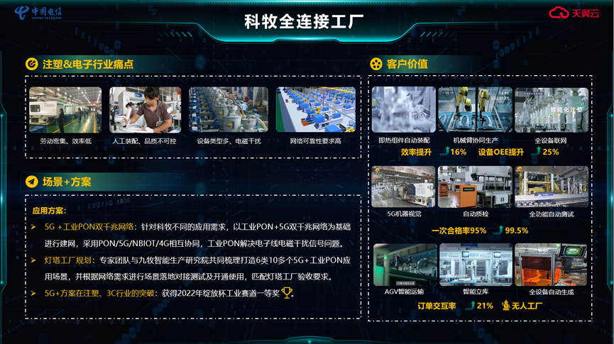 在全連接工廠展區(qū),中國(guó)電信在智慧工業(yè)、智慧能源、智慧農(nóng)業(yè)、智慧車(chē)聯(lián)網(wǎng)等領(lǐng)域傾心培育的合作成果也將悉數(shù)展出。其中,科牧5G全連接工廠打造了全國(guó)首個(gè)注塑電子行業(yè)5G全連接應(yīng)用標(biāo)桿,落地了9類(lèi)“30+”5G+工業(yè)互聯(lián)網(wǎng)應(yīng)用場(chǎng)景,實(shí)現(xiàn)了1500多個(gè)設(shè)備終端接入;中核智慧工廠以5G專(zhuān)網(wǎng)、千兆光網(wǎng)建設(shè)全連接工廠基礎(chǔ)設(shè)施,打造了5G智慧工廠先進(jìn)制造業(yè)基地,實(shí)現(xiàn)多項(xiàng)業(yè)務(wù)應(yīng)用創(chuàng)新,達(dá)成中核科技集團(tuán)內(nèi)部信息流拉通,實(shí)現(xiàn)全方位達(dá)成數(shù)據(jù)要素和涉密信息的立體安全保障機(jī)制,完成了數(shù)字化全連接工廠架構(gòu)的搭建;烽火千兆工廠項(xiàng)目分別以終端側(cè)、網(wǎng)絡(luò)側(cè)和邊緣云提供協(xié)同的整體解決方案;針對(duì)電網(wǎng)“三高一低”的典型特征,中國(guó)電信5G賦能虛擬電廠應(yīng)用場(chǎng)景,將改變傳統(tǒng)電網(wǎng)“源隨荷動(dòng)”發(fā)展模式為“源荷互動(dòng)”發(fā)展新模式;而中國(guó)電信5G礦山將物聯(lián)網(wǎng)、云計(jì)算、人工智能等技術(shù)與現(xiàn)代露天礦山開(kāi)發(fā)技術(shù)深度融合,形成具有礦山全面感知、實(shí)時(shí)互聯(lián)、協(xié)同控制等功能的5G智慧礦山系統(tǒng);星火有機(jī)硅案例(包含10余項(xiàng)工業(yè)應(yīng)用場(chǎng)景)以5G MEC打通企業(yè)工業(yè)內(nèi)外網(wǎng)的安全可靠連接,通過(guò)5G工業(yè)網(wǎng)關(guān)、智能手環(huán)、5G攝像頭、5G無(wú)人機(jī)等實(shí)現(xiàn)對(duì)工廠人、機(jī)、物的數(shù)據(jù)采集,在此基礎(chǔ)上提供“增加大數(shù)據(jù)應(yīng)用構(gòu)建全新全要素的數(shù)字孿生工廠”的解決方案;中國(guó)電信5G在光伏行業(yè)的應(yīng)用能力和實(shí)踐旨在通過(guò)5G+工業(yè)互聯(lián)網(wǎng)融合創(chuàng)新實(shí)現(xiàn)5G全連接數(shù)字工廠的目標(biāo),構(gòu)建太陽(yáng)能云平臺(tái)生態(tài)圈,借助5G+MEC、工業(yè)互聯(lián)網(wǎng)、云計(jì)算(AI)、大數(shù)據(jù)、機(jī)器視覺(jué)等先進(jìn)技術(shù)實(shí)現(xiàn)對(duì)光伏產(chǎn)品智能制造及光伏電站運(yùn)維的“人機(jī)料法環(huán)測(cè)”等環(huán)節(jié)的管控;上汽行業(yè)云則以打造一朵安全可信的云、一張跨域信息網(wǎng)、一個(gè)行業(yè)通用數(shù)據(jù)平臺(tái)、一組汽車(chē)SaaS應(yīng)用、一個(gè)汽車(chē)服務(wù)生態(tài)圈,共同為上汽超過(guò)300家生態(tài)鏈企業(yè)提供云網(wǎng)服務(wù)及安全運(yùn)營(yíng)服務(wù),有力支持上汽集團(tuán)“電動(dòng)化、網(wǎng)聯(lián)化、智能化、共享化”新四化戰(zhàn)略轉(zhuǎn)型、引領(lǐng)中國(guó)汽車(chē)行業(yè)科技創(chuàng)新;智慧糧食云平臺(tái)實(shí)現(xiàn)了平臺(tái)、庫(kù)點(diǎn)和農(nóng)戶(hù)的多級(jí)管理與系統(tǒng)的互連互通,以及“點(diǎn)、線、面”全方位遠(yuǎn)程監(jiān)管。