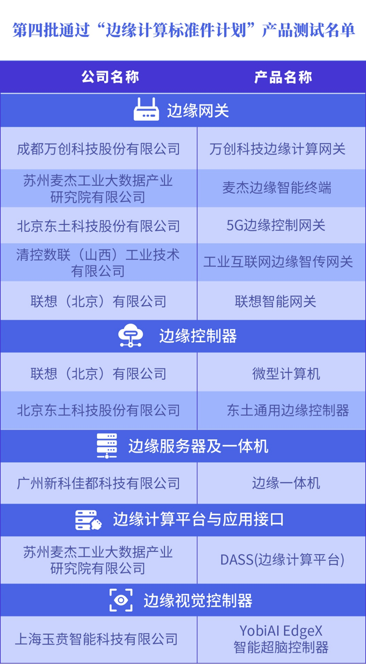 隨后,論壇公布了第四批“邊緣計算標準件計劃”測試結(jié)果。來自聯(lián)想、東土科技、麥杰科技、玉賁智能、清控數(shù)聯(lián)、萬創(chuàng)科技、佳都科技等企業(yè)的產(chǎn)品順利通過第四批“邊緣計算標準件計劃”測試。