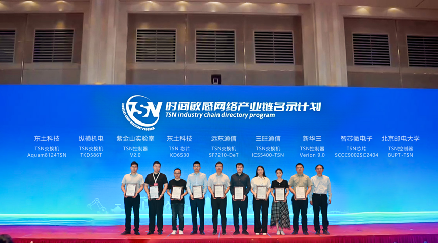 2023年6月16日上午,在蘇州舉辦的“2023工業(yè)互聯(lián)網(wǎng)大會-工業(yè)互聯(lián)網(wǎng)網(wǎng)絡創(chuàng)新發(fā)展論壇”上,中國信息通信研究院院長、工業(yè)互聯(lián)網(wǎng)產(chǎn)業(yè)聯(lián)盟理事長余曉暉發(fā)布了“TSN產(chǎn)業(yè)鏈名錄計劃”第二批評測通過的芯片、控制器、交換機等產(chǎn)品名單,并為北京東土科技股份有限公司、北京縱橫機電科技有限公司、紫金山實驗室、河北遠東通信系統(tǒng)工程有限公司、深圳市三旺通信股份有限公司、新華三技術(shù)有限公司、北京智芯微電子科技有限公司、北京郵電大學等8家名錄企業(yè)代表頒發(fā)了證書。