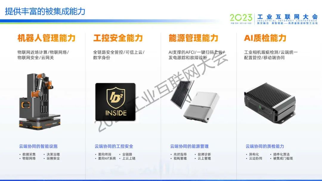 平臺(tái)面向單個(gè)設(shè)備、單條產(chǎn)線、多工廠多基地三個(gè)場(chǎng)景,提供設(shè)備級(jí)物聯(lián)運(yùn)維、產(chǎn)線級(jí)生產(chǎn)監(jiān)控、多工廠多基地的制造協(xié)同平臺(tái)等標(biāo)準(zhǔn)產(chǎn)品服務(wù),同時(shí)提供云邊協(xié)同的機(jī)器人管理能力、工控安全能力、能源管理能力、AI質(zhì)檢能力等,讓用戶按需選擇靈活集成到自有系統(tǒng)中。