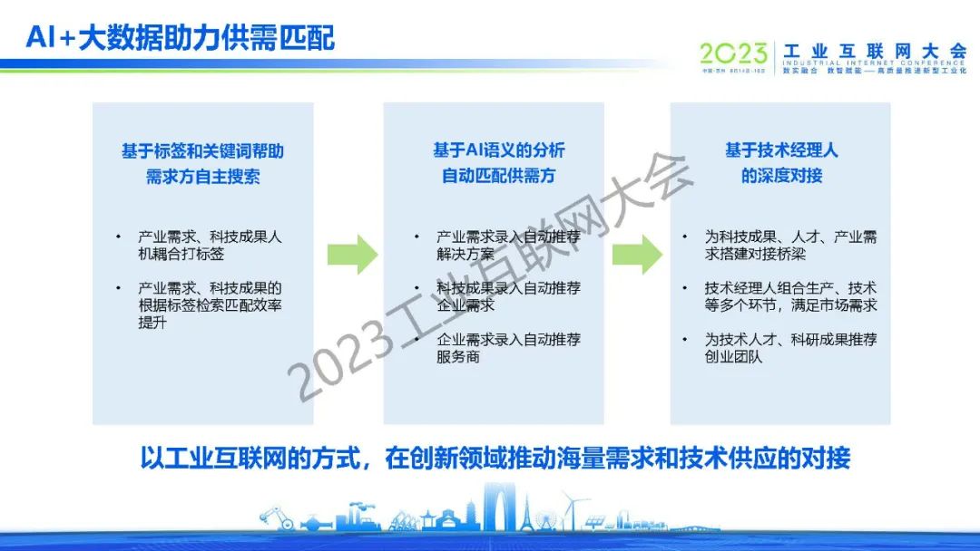“AI+大數(shù)據(jù)助力供需匹配,通過基于標(biāo)簽和關(guān)鍵詞幫助需求方自主搜索、基于AI語義的分析自動(dòng)匹配供需方和基于技術(shù)經(jīng)理人的深度對(duì)接三個(gè)方式,在創(chuàng)新領(lǐng)域推動(dòng)海量需求和技術(shù)供應(yīng)的對(duì)接。“
