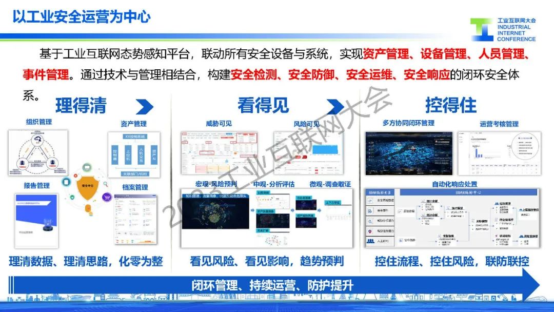 “基于工業互聯網態勢感知平臺,聯動所有安全設備與系統,實現資產管理、設備管理、人員管理、事件管理。通過技術與管理相結合,構建安全檢測、安全防御、安全運維、安全響應的閉環安全體系。”