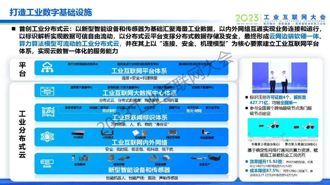 “首創工業分布式云是以新型智能設備和傳感器為基礎匯聚海量工業數據,以內外網絡互通實現業務連接和運行,以標識解析實現數據可信自由流動,以分布式云平臺支撐分布式數據存儲及安全,最終形成云網邊端軟硬一體、算力算法模型可流動的工業分布式云,并在其上以“連接、安全、機理模型”為核心要素建立工業互聯網平臺體系,實現云數智一體化的服務能力。“