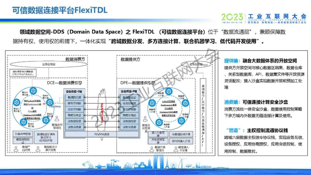 領域數據空間-DDS(Domain Data Space)之 FlexiTDL (可信數據連接平臺)位于“數據流通層”,兼顧保障數據持有權、使用權的前提下,一體化實現“跨域數據分發、多方連接計算、聯合機器學習、低代碼開發使用”。