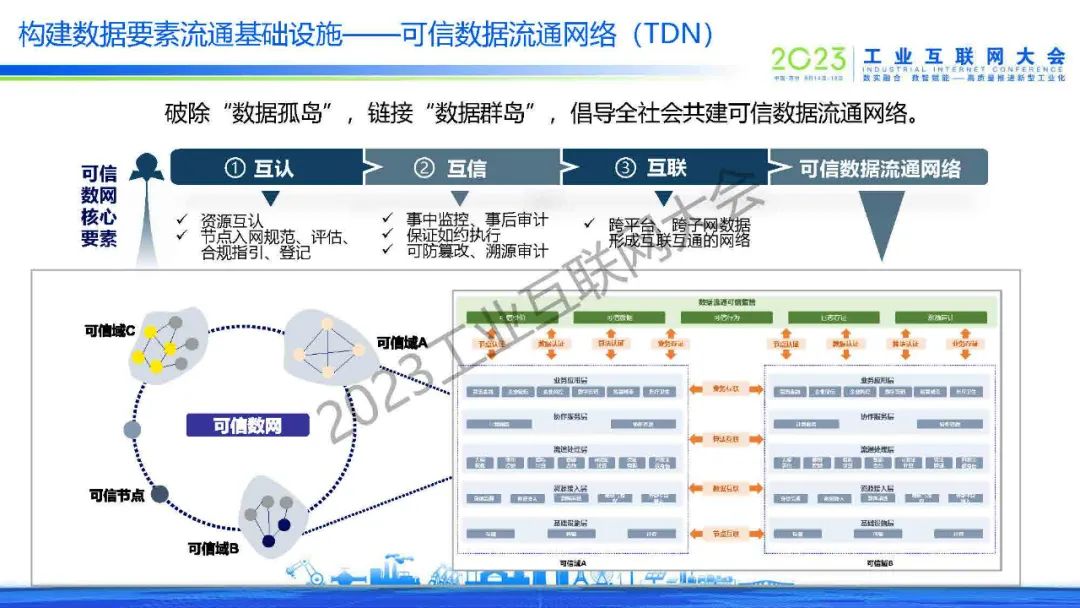 魏凱表示,數(shù)據(jù)要素收益分配與安全治理是“數(shù)據(jù)二十條”的重要內(nèi)容。圍繞數(shù)據(jù)資產(chǎn)管理和數(shù)據(jù)治理,中國信通院持續(xù)探索企業(yè)數(shù)據(jù)治理能力、數(shù)據(jù)資產(chǎn)、數(shù)據(jù)估值、數(shù)據(jù)質(zhì)量評估、數(shù)據(jù)開發(fā)運營一體化等前沿課題??尚艛?shù)據(jù)流通網(wǎng)絡(luò)(TDN)破除“數(shù)據(jù)孤島”,鏈接“數(shù)據(jù)群島”,倡導(dǎo)全社會共建可信數(shù)據(jù)流通網(wǎng)絡(luò)。