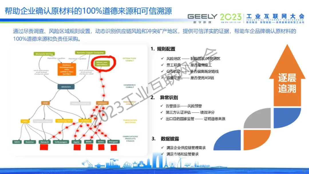 賽磊表示,環境和社會實踐要求企業實現供應鏈的透明度,確認“鈷”“稀土”等原材料的道德來源,樹立品牌聲譽獲得市場和消費者信任。面對于復雜供應鏈,數字化追溯是剛需。溯源的兩個重要組成部分,首先供應鏈透明度和可見性,其次數據信息披露、滿足監管合規。