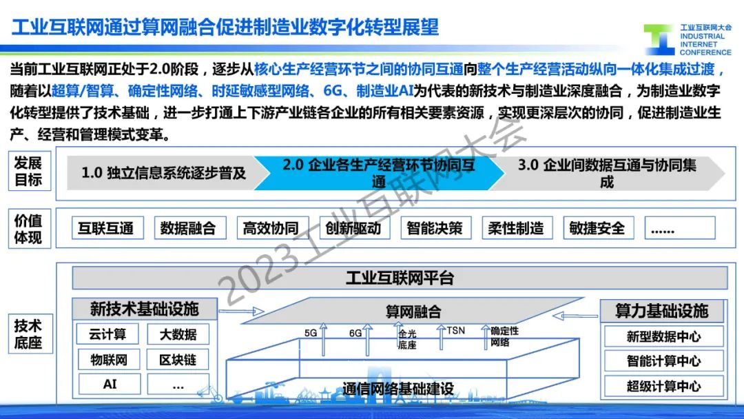 戴中華指出,當前工業互聯網正處于2.0階段,逐步從核心生產經營環節之間的協同互通向整個生產經營活動縱向一體化集成過渡, 隨著以超算/智算、確定性網絡、時延敏感型網絡、6G、制造業AI為代表的新技術與制造業深度融合,為制造業數字 化轉型提供了技術基礎,進一步打通上下游產業鏈各企業的所有相關要素資源,實現更深層次的協同,促進制造業生 產、經營和管理模式變革。