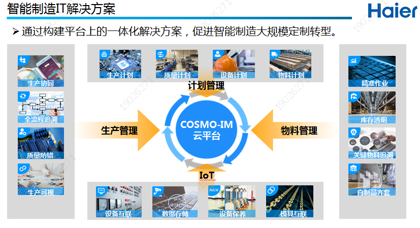 海爾建設(shè)了以企業(yè)資源計(jì)劃管理系統(tǒng)(ERP)系統(tǒng)為核心的信息化系統(tǒng)。實(shí)現(xiàn)了從模塊商資源網(wǎng),多渠道接單及訂單管理(OMS),工廠生產(chǎn)能力建模分析及訂單分配(OES),工廠主生產(chǎn)計(jì)劃安排(APS),生產(chǎn)過程的質(zhì)量信息和成本跟蹤和過程管控(MES),產(chǎn)品生命周期管理(PLM)及虛擬仿真,供應(yīng)鏈智能物料配送和倉(cāng)儲(chǔ)管理系統(tǒng)(WMS)等。