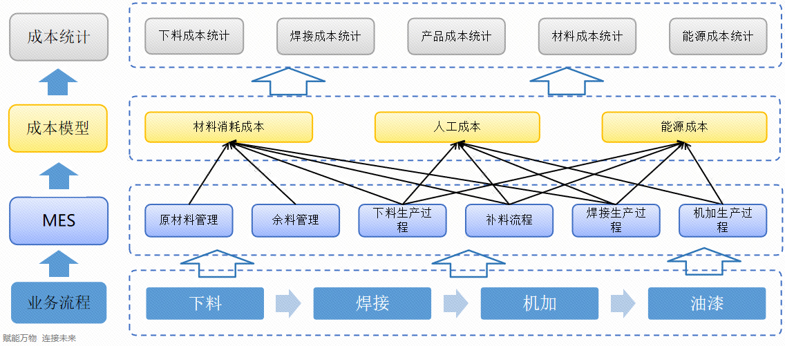 通過建立生產成本分析模型,并對制造成本進行細化,輸出制造實際成本分析,為制造改進實施提供數據支持。可按照生產過程下料、焊接、機加等工序段進行記錄與統計。