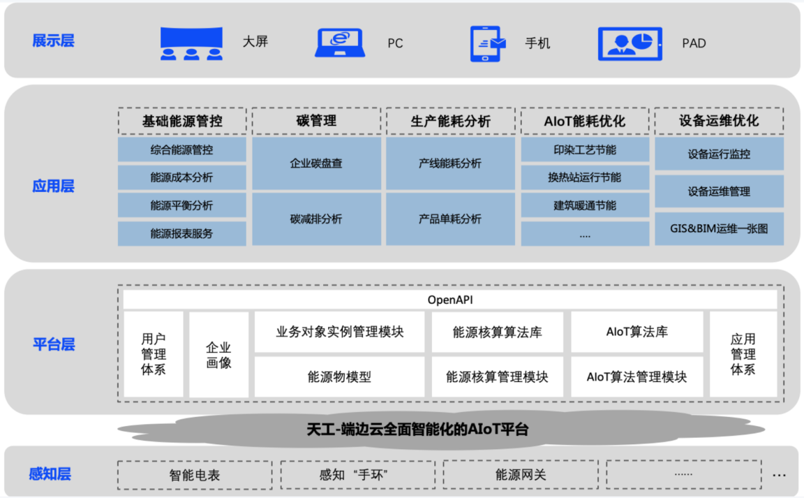 基礎能源平臺:基礎能源平臺是支撐能源接入的基礎,為能源管理應用的實例化構建、穩健物聯接入、數據方法抽取、邊云模型計算等搭建基礎底座。按照功能劃分為企業信息管理、物聯模型管理、設備儀表管理三個模塊。企業信息管理,完成企業基礎畫像的描繪,主要進行組織機構、建筑信息、人員信息、基礎用能信息的管理。支撐業務核算在各種維度的靈活編排。物聯模型管理,對能源場景的物聯設備,進行統一的數字化點表創建,完成解析點表、運算屬性、閾值上下限設置等功能。儀表設備管理,對設備模型的實例化,并進行儀表與設備的臺賬信息匹配,完成物理世界與數字世界的對照映射。核算分析模型管理,定義企業的核算時間、成本模型、核算分析單元、核算公式信息。通過配置,明確企業的核算時間、班組時間段、各能源類型的成本核算方式、分析的維度、分析的單元以及各分析單元的能耗計量公式和成本核算公式。