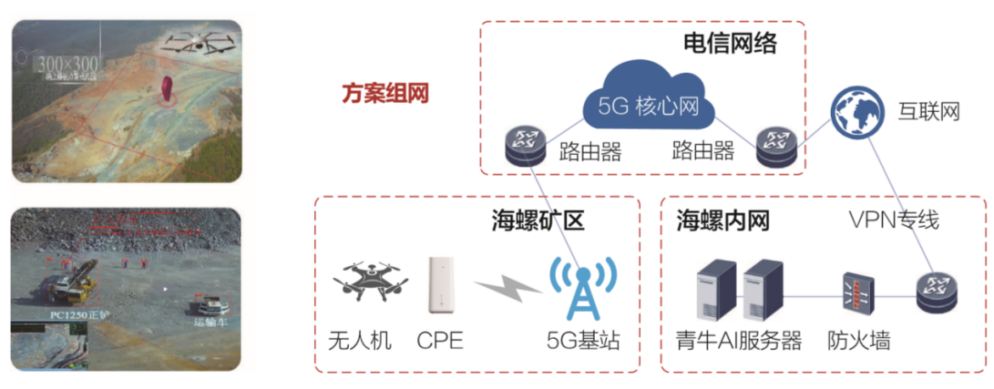 無人機通過5G 將監(jiān)控到的礦場高清視頻傳送到天翼云上AI平臺進行分析,當(dāng)分析到爆破范圍內(nèi)有人或者設(shè)備,AI系統(tǒng)將通過一體化AI平臺進行報警,爆破完成后,無人機采集地形變化,更新3D模型,指導(dǎo)后續(xù)爆破和開采。