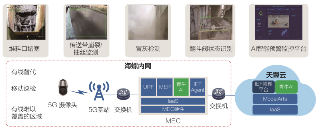 利用5G的大帶寬、高可靠性特點,對水泥制造和園區(qū)安全,生產(chǎn)過程中需要人力監(jiān)控的點進行了判斷,通過AI開發(fā)出專門算法,在堆料口堵塞,傳動帶崩裂檢測,冒灰污染檢測,翻斗閥檢測等方式進行了機器視覺應(yīng)用開發(fā),同時針對園區(qū)人員不安全行為,也都增加了AI 安全檢測,當(dāng)報警達(dá)到閾值,或AI識別出人員不安全行為,會實時告警。