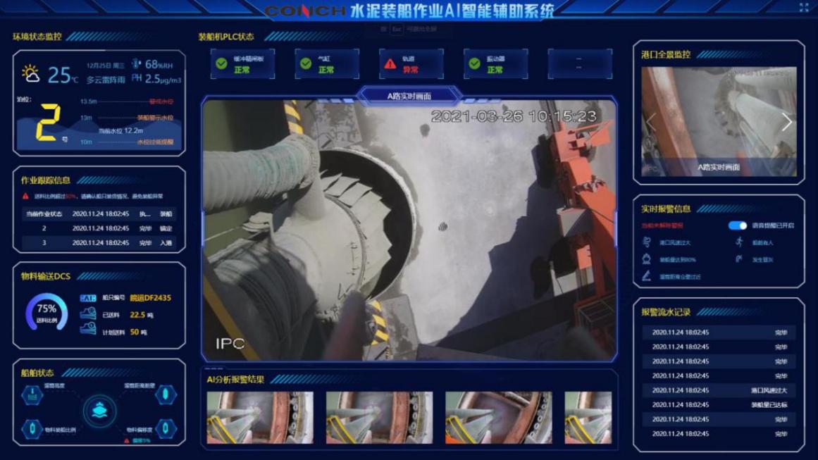 安徽海螺集團有限責(zé)任公司與中國電信合作,開展了“5G+AI+智慧裝船”項目建設(shè),實現(xiàn)了精準(zhǔn)動態(tài)作業(yè)場景的應(yīng)用。通過搭建多視角相機,確定不同相機間同一物體的對應(yīng)關(guān)系,根據(jù)三角測量原理,實時監(jiān)測水泥船位置以及裝船機溜筒位置和姿態(tài),包括船舷位置、溜筒距船舷偏移比例、物料偏移度等。對數(shù)據(jù)進行AI分析,并通過5G網(wǎng)絡(luò)將結(jié)果與預(yù)警信息傳送到指揮調(diào)度中心,基于中心控制算法.發(fā)送指令到裝船機可編程邏輯控制器(PLC),實時控制裝船機作業(yè),避免因位置不當(dāng)引起碰壁、冒灰和其他視野受限情況,實現(xiàn)對裝船作業(yè)的全流程監(jiān)控。項目實施后,生產(chǎn)效率提升70%,人員安全事故數(shù)降低到0。