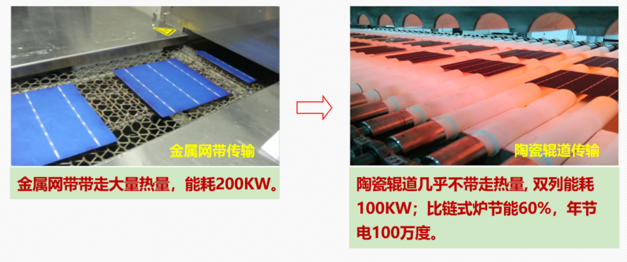 材料創(chuàng)新與工藝創(chuàng)新,實(shí)現(xiàn)節(jié)能減碳。使用陶瓷輥道,代替原有金屬網(wǎng)帶,實(shí)現(xiàn)綠色節(jié)能科技創(chuàng)新。采用高純陶瓷輥道代替金屬網(wǎng)帶傳輸電池片,因?yàn)檫M(jìn)出爐子的只有質(zhì)量很輕的電池片,帶走的熱量極少,因此比鏈?zhǔn)綘t節(jié)能可達(dá)50%,單臺(tái)爐每年可節(jié)電100萬(wàn)度。