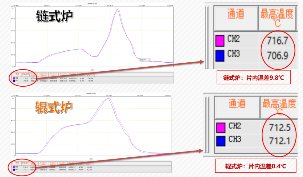 此外數(shù)字化信息化技術(shù)的應(yīng)用,使傳輸精度大幅提高,并實(shí)現(xiàn)精準(zhǔn)掌控。一方面,實(shí)現(xiàn)實(shí)時(shí)各產(chǎn)線運(yùn)行狀況監(jiān)控。另一方面,通過(guò)自動(dòng)化調(diào)節(jié),使電池片整個(gè)燒制過(guò)程溫差控制在0.4℃,確保太陽(yáng)能電池成品沒有EL云片和黑斑,電池的不良比率幾乎為0(金屬網(wǎng)帶鏈?zhǔn)綗Y(jié)爐片內(nèi)溫差為9.8℃,EL云片和黑斑不良率約3%)。