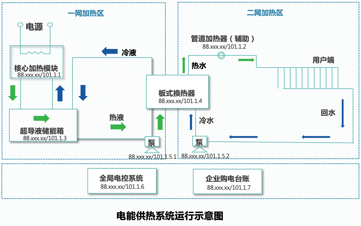 項目實施總體架構的第一步是核算邊界和排放源,經過供暖系統全環節巡視,確認碳排放核算邊界主要為核心加熱模塊、管道加熱模塊、超導液儲能箱、電泵室泵機、電控系統、板式換熱器等裝置的集合,不包括系統外圍輔助設施。排放源為購入使用電力產生的二氧化碳排放。