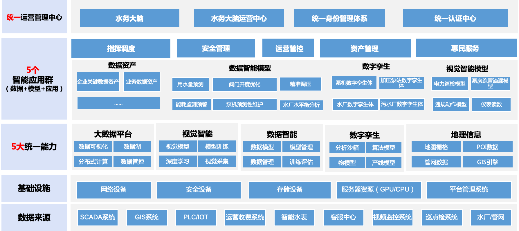 水務(wù)大腦建設(shè)緊緊圍繞著集團信息化戰(zhàn)略要求,以智慧管理、高效服務(wù)的主旨,按照業(yè)務(wù)主導、數(shù)據(jù)驅(qū)動、頂層設(shè)計、統(tǒng)一標準的原則,打造“1+5+5整體架構(gòu)?!?/span>1 是建設(shè)一套統(tǒng)一運營管理中心,實現(xiàn)集團層面辦公、業(yè)務(wù)與運營的統(tǒng)一管理。第一個“5是打造五統(tǒng)一的信息化能力平臺,包括統(tǒng)一大數(shù)據(jù)平臺、統(tǒng)一視覺智能平臺統(tǒng)一數(shù)據(jù)智能平臺、統(tǒng)一地理信息平臺統(tǒng)一數(shù)字孿生平臺。第二個“5是構(gòu)建五個可擴展的智慧應(yīng)用群,包括指揮調(diào)度智慧應(yīng)用群安全管理智慧應(yīng)用群、運營管控智慧應(yīng)用群資產(chǎn)管理智慧應(yīng)用群惠民服務(wù)智慧應(yīng)用群。如圖1所示。