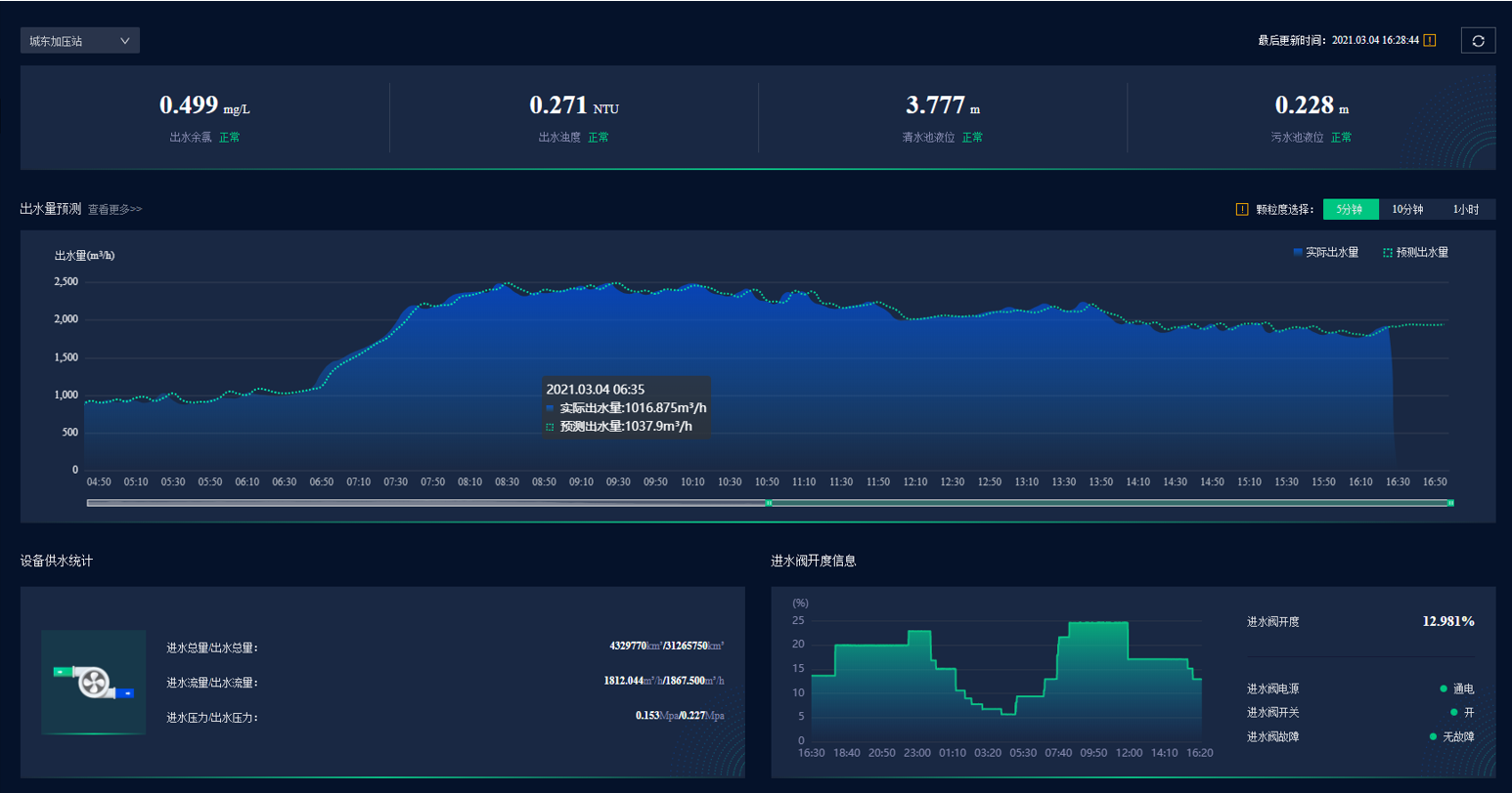 1目前常規(guī)泵房的供水壓力控制為變頻恒壓,此種壓力設(shè)定方法不夠靈活與智能,沒有把控用戶真正的用量需求,不能及時的根據(jù)用戶需求的變化來做出調(diào)整及響應(yīng),用戶用水體驗差,管網(wǎng)平均壓力偏高,增加了管網(wǎng)漏損的風險。且泵機組合以及泵組輪換依賴人工經(jīng)驗,泵站未必工作在當前工況下最優(yōu)工作點,不利于節(jié)能降耗。水務(wù)大腦通過折線圖和陰影圖組合,直觀的展示實際出水量和預測出水量的信息,模型精度在99%以上。