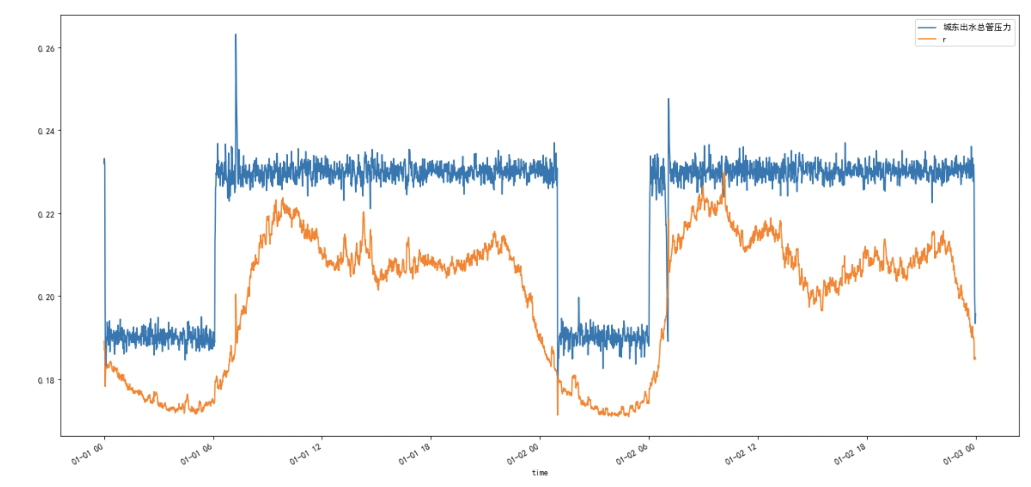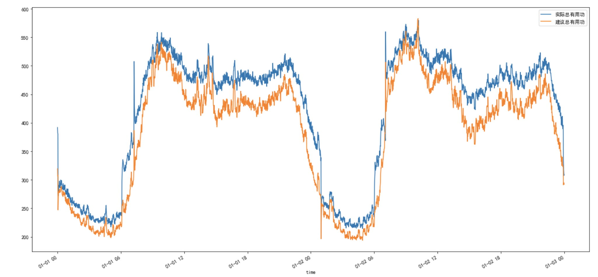 3通過函數(shù)進行擬合,觀察歷史某兩日出水管的實際壓力和建議壓力,中間的面積為實際的節(jié)能空間;經(jīng)過計算,為客戶提出在某兩年,使用建議壓力可以節(jié)能8%的電能。