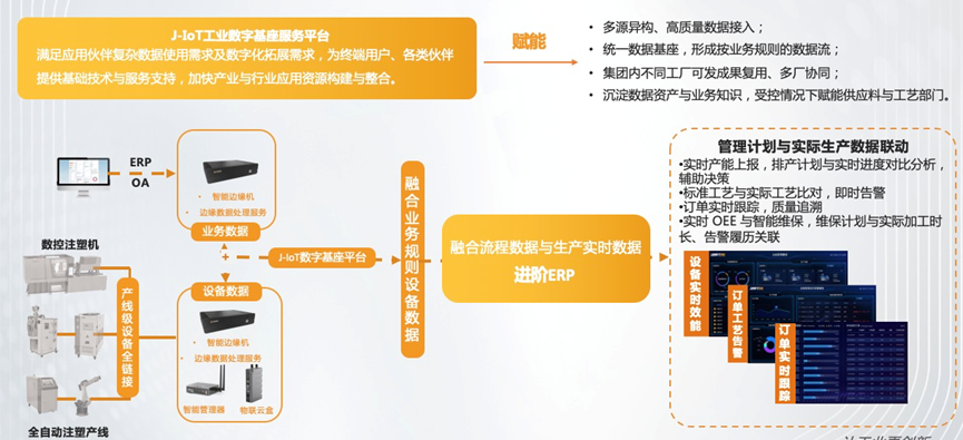 精密注塑數智場景項目:本項目打造的注塑成型數智場景,是注塑行業的標桿,也是當地數字化智能化車間的示范單位,獲得了用戶集團內部的高度評價,已經形成了體系化、標準化的可推廣復制模式。本項目在注塑成型環節,以可量化的ROI指標完成了驗收,提升了產品的良率和工藝管理水平,每個工作中心平均年提升效益約85萬元,建設成果包括數據采集、設備接入、精密注塑模型應用以及IOT-ERP-MES-OA-WMS生態聯動模式。