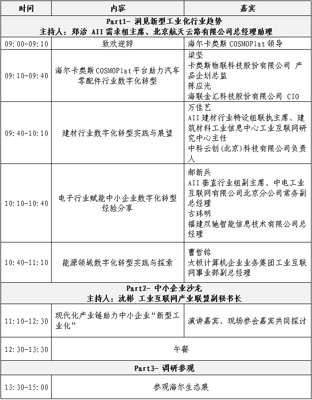 本月26日,AII將聯合海爾卡奧斯COSMOPlat共同舉辦“我為企業辦實事”系列活動——工業互聯網垂直行業融通創新沙龍。本次沙龍邀請到了家電行業、建材行業、電子行業、能源行業的代表企業卡奧斯、建材工業信息中心、中國電子、太極集團負責人分享行業經驗,共同探討現代化產業鏈如何賦能中小企業“新型工業化”的熱門話題。活動安排具體如下: