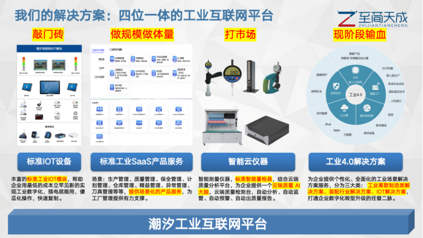 用一句話概括至簡天成在做的事情:基于廣大中小制造業企業生產場景中遇到的核心痛點問題,打造一系列普世化、輕量級、好落地的工業SaaS產品服務,助力中小企業快速實現數字化轉型+升級。